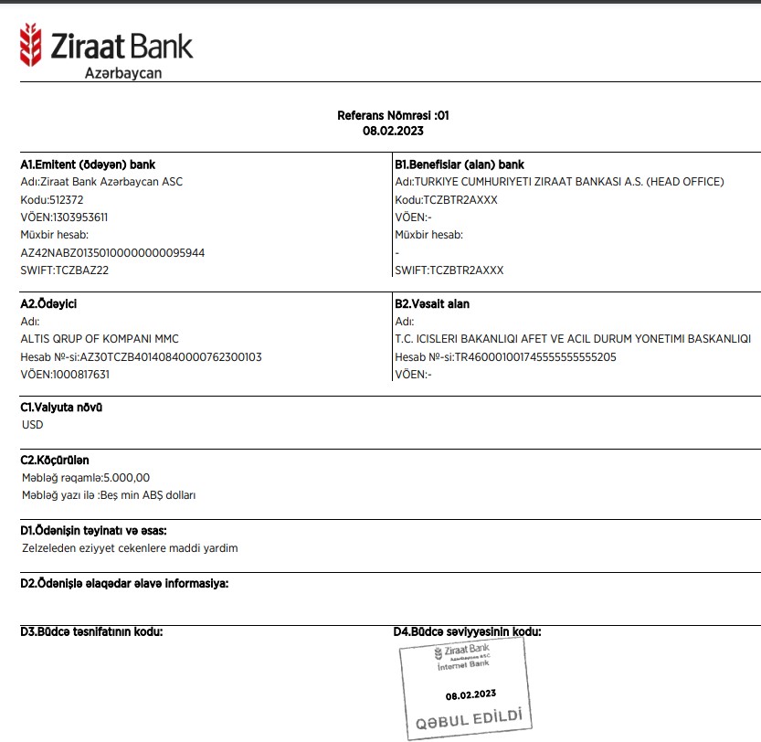 Tanınmış iş adamı Şamil Heyderovun təsisçisi və rəhbəri olduğu "Altis Group of Companies" və "Altec Aluminium" MMC şirkətləri Türkiyənin Fövqəladə Halların İdarə Olunması Agentliyinə (AFAD) 200.000 türk lirəsi (TL) məbləğində ianə edib.
