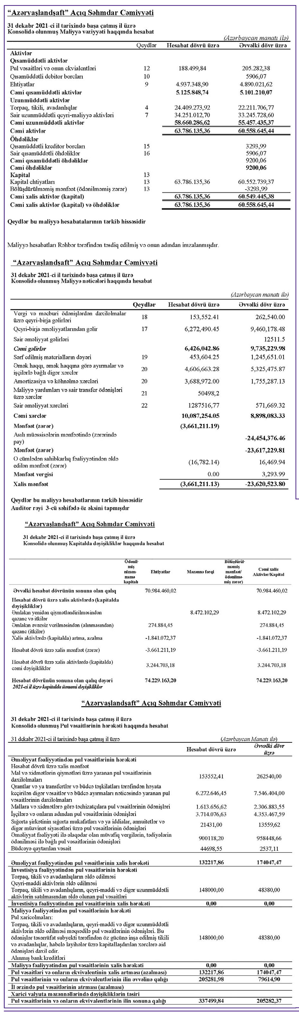 Müqayisə üçün qeyd edək ki, 2020-ci ildə şirkətin cəmi gəlirləri 9 milyon 735 min manat, cəmi xərcləri 8 milyon 898 min manat təşkil etmişdi. Asılı müəssisələrin 24 milyon 454 min manat zərəri ilə əlaqədar olaraq “Azəryaşlandşaft” 2020-ci ili 23 milyon 620 min manat xalis zərər ilə başa vurmuşdu.