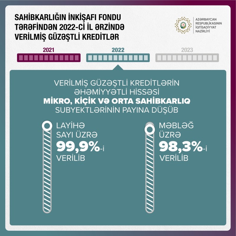 Sahibkarlığın İnkişafı Fondu tərəfindən 2022-ci ildə verilmiş güzəştli kreditlərin əhəmiyyətli hissəsi mikro, kiçik və orta sahibkarlıq subyektlərinin payına düşüb.