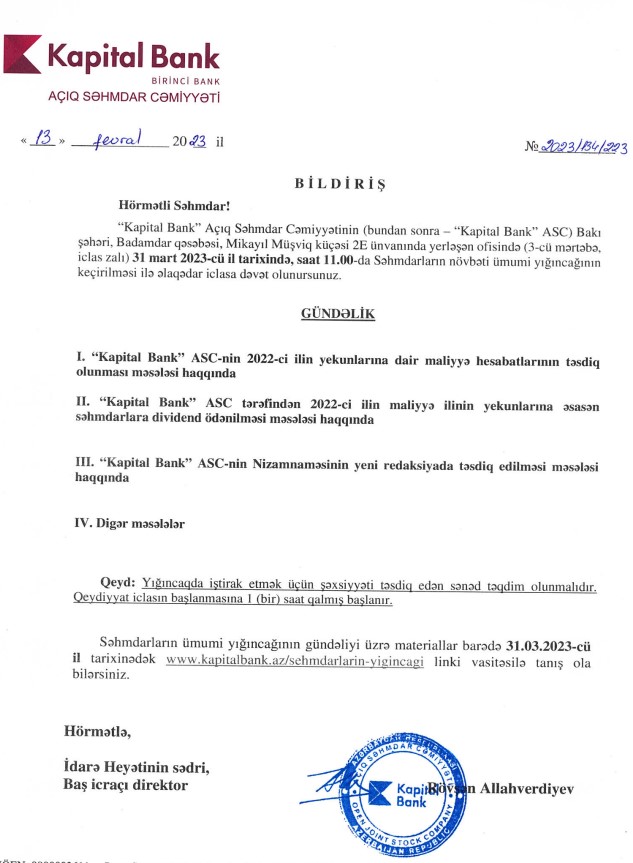 31 Mart 2023-cü il tarixində "Kapital Bank" ASC səhmdarlarının növbəti ümumi yığıncağı keçiriləcək.