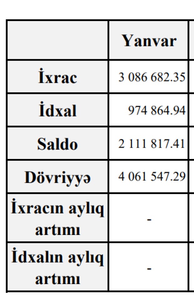 Xatırladaq ki, 2022-ci ilin yanvar ayında Azərbaycanın xarici ticarət əməliyyatlarının həcmi 4 milyard 61 milyoyn 547 min ABŞ dolları, o cümlədən ixrac əməliyyatları 3 milyard 86 milyon 682 min ABŞ dolları, idxal əməliyyatları 974 milyon 865 min ABŞ dolları, saldo 2 milyard 111 milyon 817 min ABŞ dolları təşkil etmişdi.