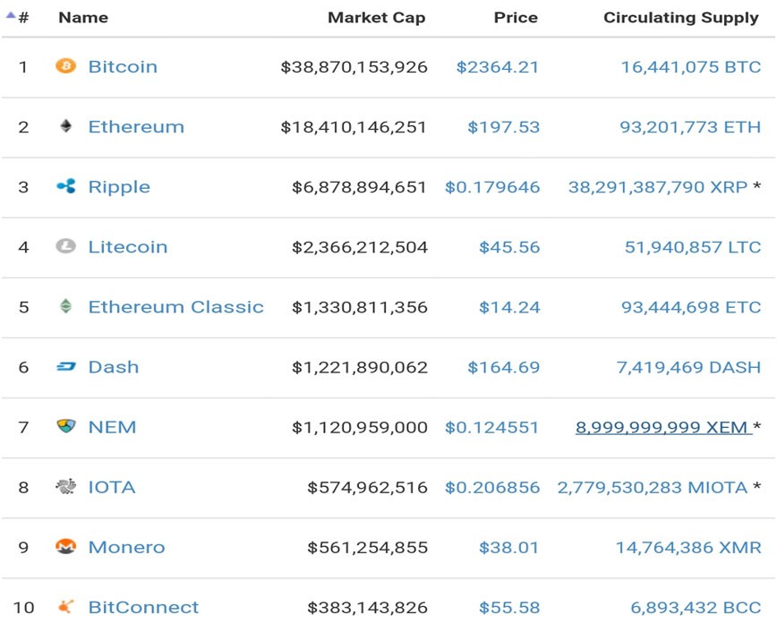 Beynəlxalq kriptovalyuta birjalarında 900 adda coin (koin) mübadilə edilir. Bu kriptovalyutaların bazar kapitallaşması, hər bir vahidi üzrə qiyməti və sayı barədə ən etibarlı məlumatlara www.coinmarketcap.com saytında baxmaq olar. 11.07.2017 tarixinə bazar kapitallaşmasına görə top onluqda olan kriptovalyutaların sıyahısını nəzərdən keçirək.