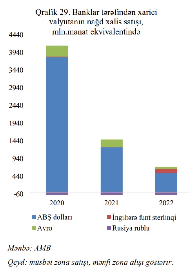 Banklar tərəfindən nağd xarici valyutanın alqı-satqısı üzrə aparılmış əməliyyatların həcmi 2021-ci ilə nəzərən 27% artaraq 5.1 mlrd. ABŞ dolları ekvivalentində olmuşdur. Bunun 85.7%- ni ABŞ dolları ilə aparılmış əməliyyatlar təşkil etmişdir. 2022-ci ilin aprel ayından başlayaraq ilin sonuna qədər xarici valyutanın alışının satışından yüksək olması hesabına xalis xarici valyuta satışı ötən ilə nəzərən 5 dəfə azalmışdır.