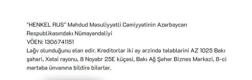 "HENKEL RUS" şirkətinin Azərbaycan nümayəndəliyi ləğv olunur