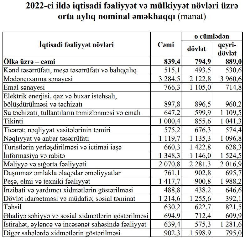 Mədənçıxarma sənayesində, maliyyə və sığorta fəaliyyəti, peşə, elmi və texniki fəaliyyət, eləcə də informasiya və rabitə sahələrində orta aylıq nominal əməkhaqqı ölkə üzrə orta göstəricidən yüksək olmuşdur.