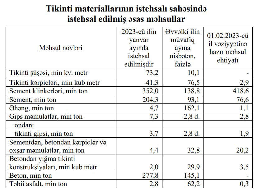 Tikinti materiallarının istehsalı sahəsində 2023-сü ilin yanvar ayında istehsalın ümumi dəyəri 60,7 milyon manat olmaqla, əvvəlki ilin müvafiq ayı ilə müqayisədə 20,7 faiz artıb.