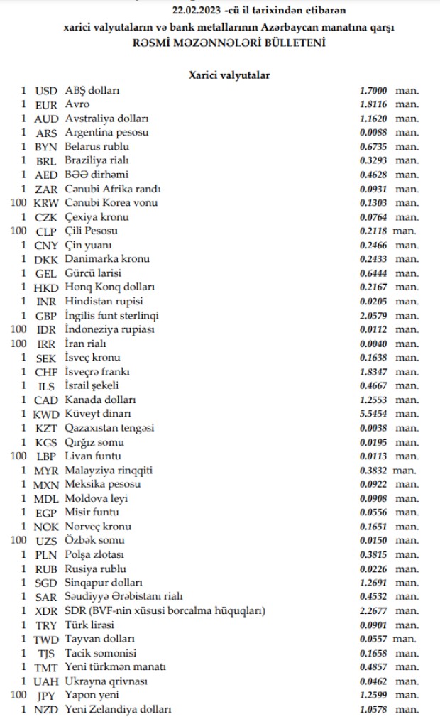 Dolların bazar ertəsi üçün rəsmi məzənnəsi müəyyən olunub