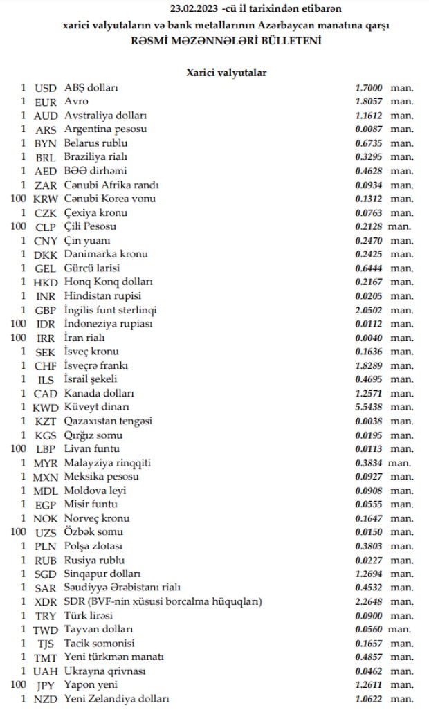 Dolların bazar ertəsi üçün rəsmi məzənnəsi müəyyən olunub