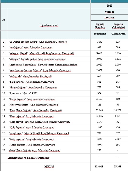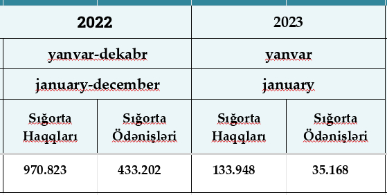 2023-cü ilin yanvar ayında Azərbaycanın sığorta şirkətləri tərəfindən 133 milyon 948 min manat sığorta haqları hesablanıb, 35 milyon 168 min manat sığorta ödənişləri həyata keçirilib.