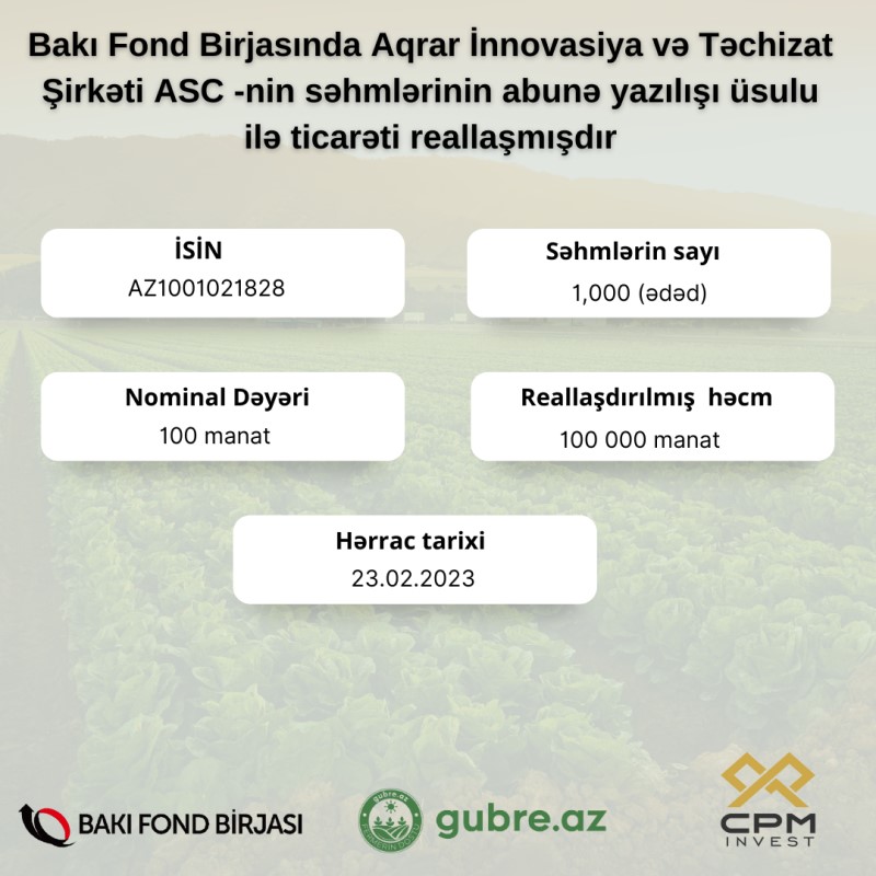 23 fevral 2023-cü il tarixində ticarətə buraxılan Aqrar İnnovasiya və Təchizat Şirkəti ASC-nin AZ1001021828 dövlət qeydiyyat nömrəli, 100 min manat həcmində, adi adlı sənədsiz səhmlərinin abunə yazılışı üzrə yerləşdirilməsi Bakı Fond Birjasında yekunlaşıb.