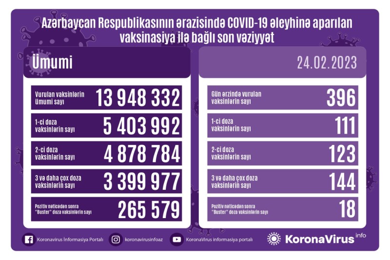Azərbaycanda son sutkada koronavirus (COVID-19) əleyhinə 396 vaksin vurulub. Bir gündə birinci mərhələ üzrə vaksinasiya olunanların sayı 111, ikinci mərhələ üzrə vaksinasiya olunanların sayı 123, üç və daha çox doza üzrə vaksinasiya olunanların sayı 144, pozitiv nəticədən sonra buster doza üzrə vaksinasiya olunanların sayı 18 nəfərdir.