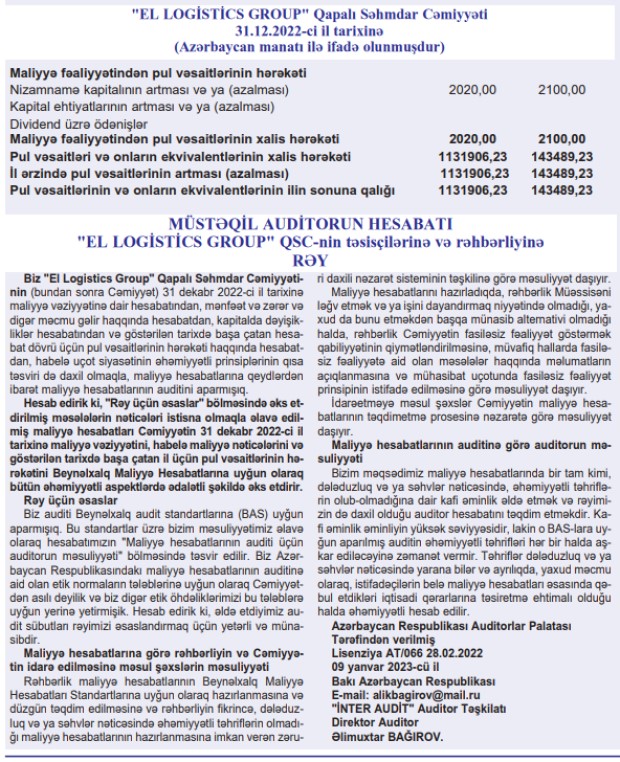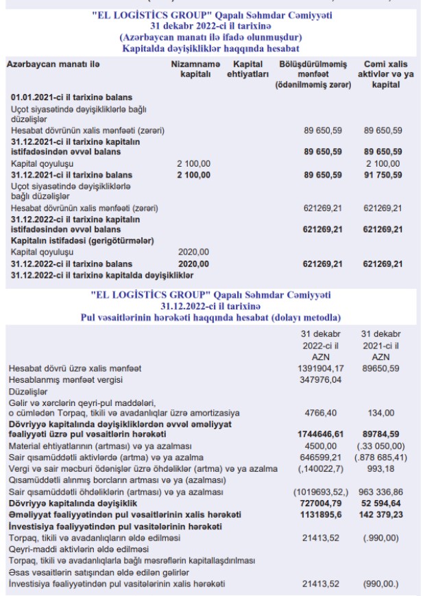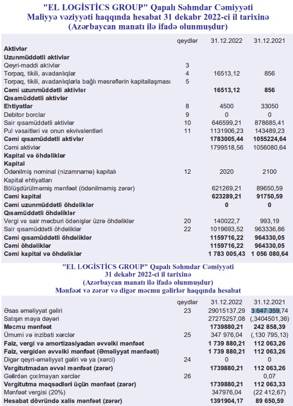 "El Logistics Group" QSC şirkəti 2022-ci ili 1 milyon 392 min manat xalis mənfəət ilə başa vurub.