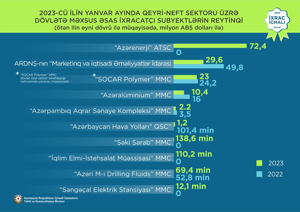2023-cü ilin yanvar ayı üzrə hazırlanan qeyri-dövlət ixracatçı subyektlərin reytinqində ilk onluqda aşağıdakı şirkətlər təmsil olunurlar: “MKT İstehsalat Kommersiya” MMC, “Azərbaycan İnterneyşnl Mayninq Kompani Limited Şirkəti”nin Azərbaycan Respublikasındakı Nümayəndəliyi, “P-Aqro” MMC, “Azərbaycan Şəkər İstehsalat Birliyi” MMC, Şirinov Elvin Valeh oğlu, “Almeyvə” MMC, “Rose Servis” MMC, “Best Logistik” MMC, “Baku Steel Company” QSC, “Mors Trading” MMC.