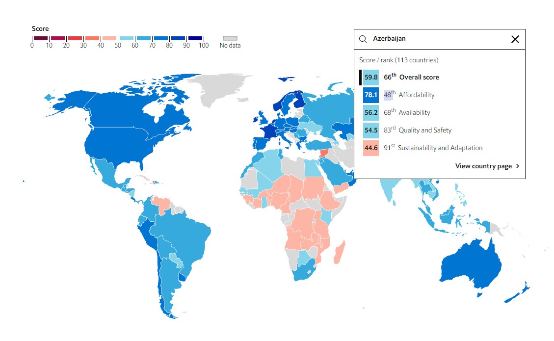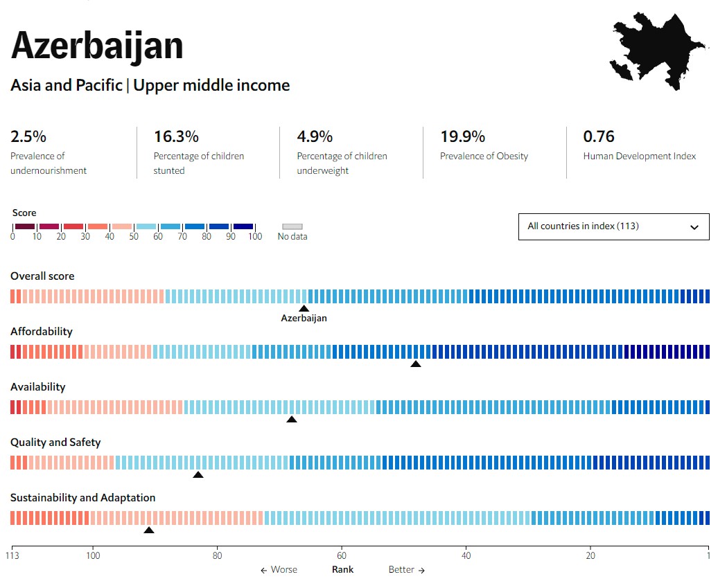 Reytinqdə dünyanın 4-cü özünü qida ilə təmin edən ölkəsi Fransadır, ardınca Hollandiya və Yaponiya gəlir. Azərbaycan bu ölkələrdən xeyli geridədir. Ölkəmiz 59.8 bal ilə 113 ölkə arasında 66-cı yerdədir.