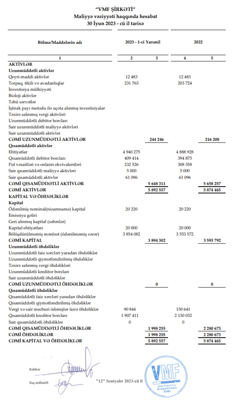 30 İyun 2023-cü il tarixində "VMF" şirkəti 5 milyon 893 min manat cəmi aktivlərə malik olub.