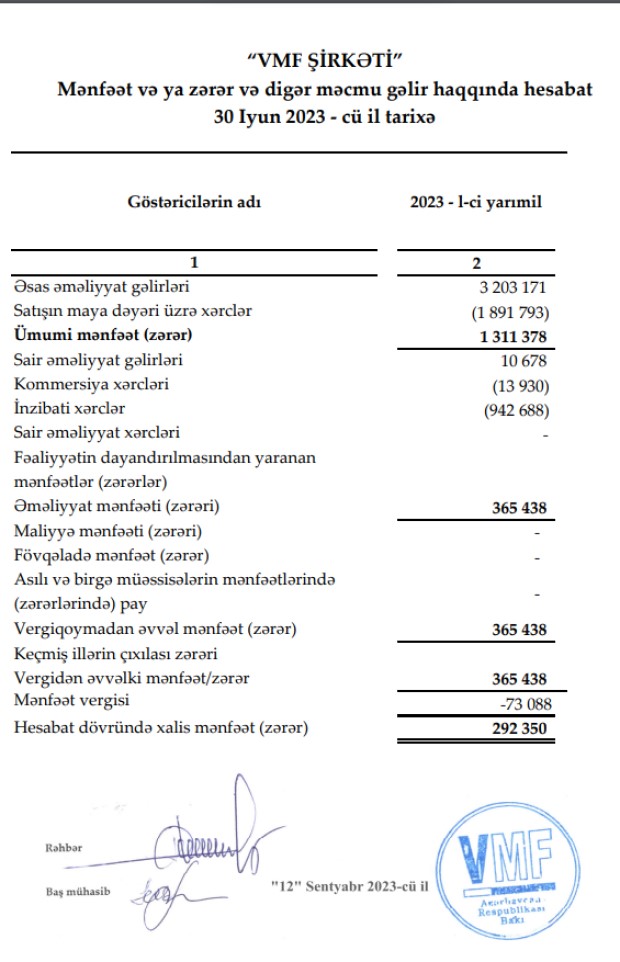 "VMF" Şirkəti 2022-ci ili 425 min 959 manat xalis mənfəət ilə başa vurmuşdu. Şirkət 2021-ci ili 462 min 926 manat, 2020-ci ili 607 min 437 manat xalis mənfəət ilə bağlamışdı.