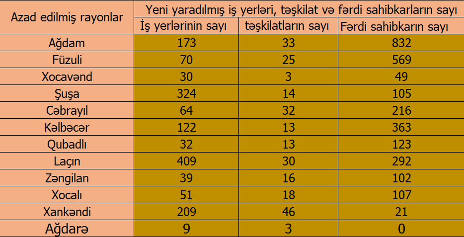Xatırladaq ki, hesabat dövründə azad edilmiş rayonlarda 246 yeni müəssisə və təşkilat, 2779 yeni fərdi sahibkarlıq subyekti dövlət qeydiyyatından keçib. Ötən ilin müvafiq dövrü ilə müqayisədə yeni yaradılmış müəssisə və təşkilatların sayı 2.4 dəfə, fərdi sahibkarların sayı isə 55.9% artıb.