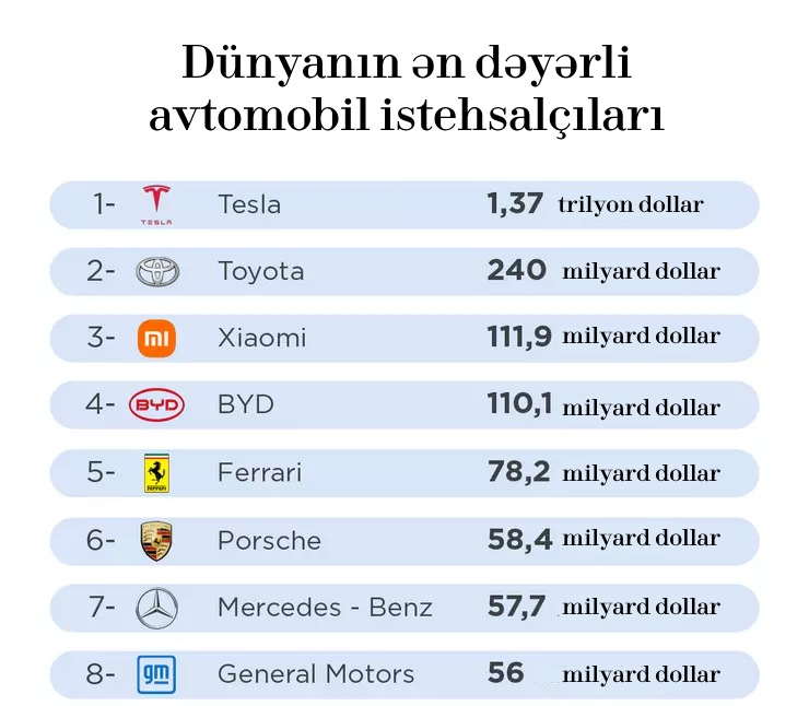 Dünyanın ən dəyərli 50 avtomobil istehsalçısı siyahısına görə, Tesla 1,37 trilyon dollarlıq bazar dəyəri ilə birinci yerdədir.Dünyanın ən dəyərli avtomobil istehsalçıları açıqlanıb.