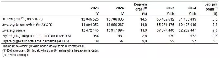 Türkiyəyə gələn turistlərin sayı 2024-cü ildə əvvəlki ilə nisbətən 9 faiz artaraq 62 milyon 232 min 447 nəfərə çatıb. Orta gecəlik xərc 97 dollar olub.