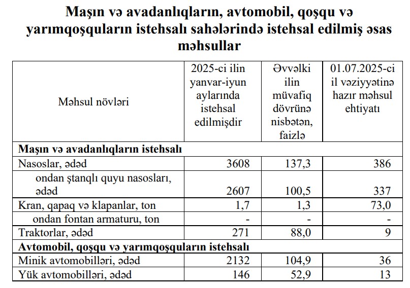 2025-сi ilin yanvar-iyun aylarında əvvəlki ilin müvafiq dövrü ilə müqayisədə traktorların istehsalı 12% azalaraq 271 ədədə, yük avtomobillərinin istehsalı isə 47,1% azalaraq 146 ədədə düşüb.