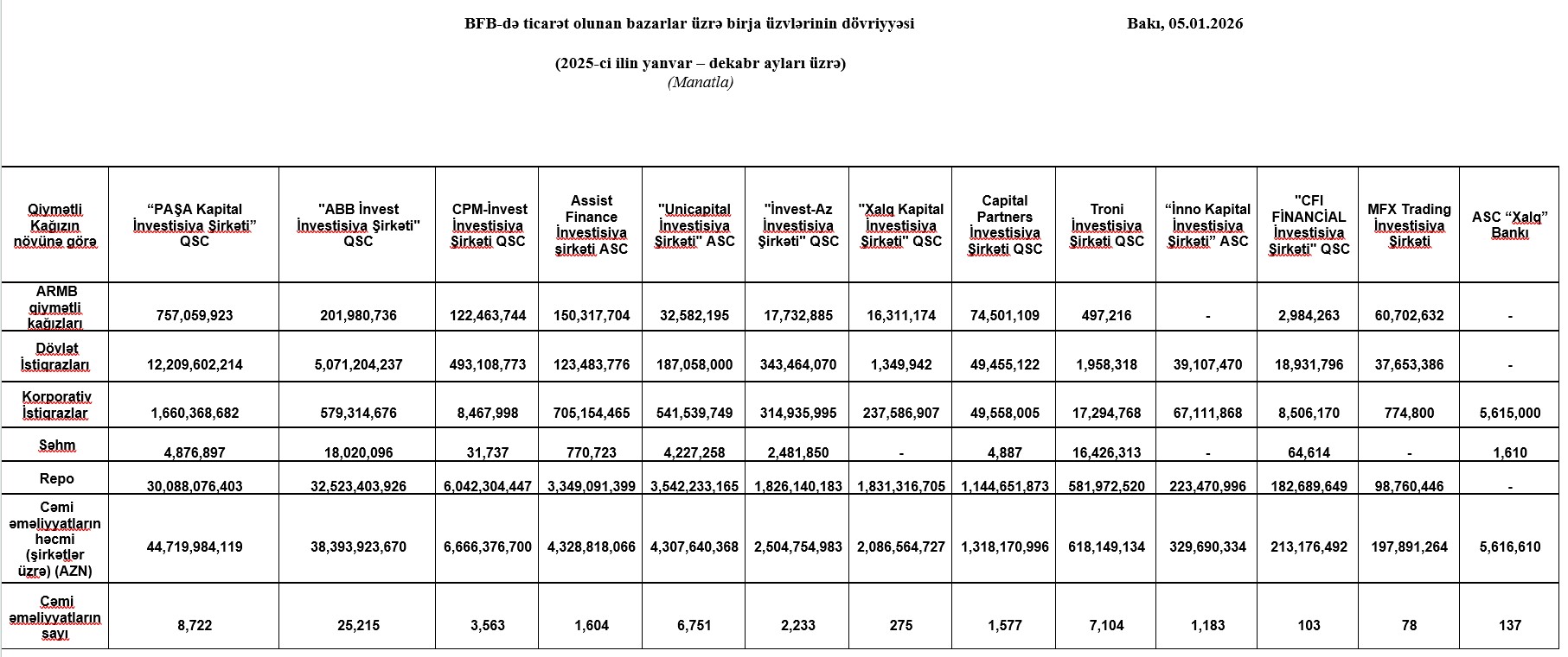 Bakı Fond Birjası 2025 BFB üzvlərinin dövriyyəsi BFB ticarət olunan bazarlar PAŞA Kapital dövriyyə ABB İnvest ticarət həcmi CPM-İnvest dövriyyə göstəricisi Assist Finance İnvestisiya Şirkəti Unicapital İnvestisiya Şirkəti İnvest-Az BFB dövriyyə Xalq Kapital İnvestisiya Şirkəti Azərbaycan fond bazarı investisiya şirkətləri reytinqi BFB statistika 2025 kapital bazarı Azərbaycan maliyyə bazarları xəbərləri Marja.az birja xəbərləri