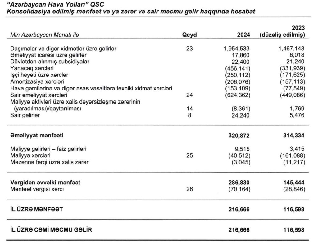 AZAL maliyyə göstəriciləri 2024 Azərbaycan Hava Yolları xalis mənfəət AZAL mənfəət artımı 2024 AZAL 216 milyon manat mənfəət AZAL 2023–2024 müqayisə quru sərhədlərin bağlı olması təsiri uçuş coğrafiyasının genişləndirilməsi AZAL gəlirləri 2024 aviaşirkət daşımalar üzrə gəlirlər AZAL əməliyyat icarəsi gəlirləri AZAL maliyyə gəlirləri AZAL subsidiya məlumatı dövlət aviaşirkəti maliyyə nəticələri AZAL əməliyyat xərcləri aviasiya sektoru Azərbaycan milli aviadaşıyıcı xəbərləri AZAL cəmi gəlirlər və xərclər Azərbaycan aviasiya bazarı AZAL iqtisadi göstəricilər Marja.az AZAL xəbərləri I prefer this response