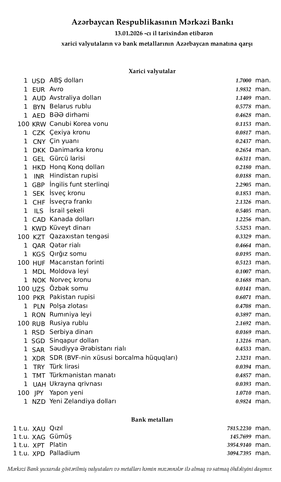 Rəsmi məzənnələr açıqlandı