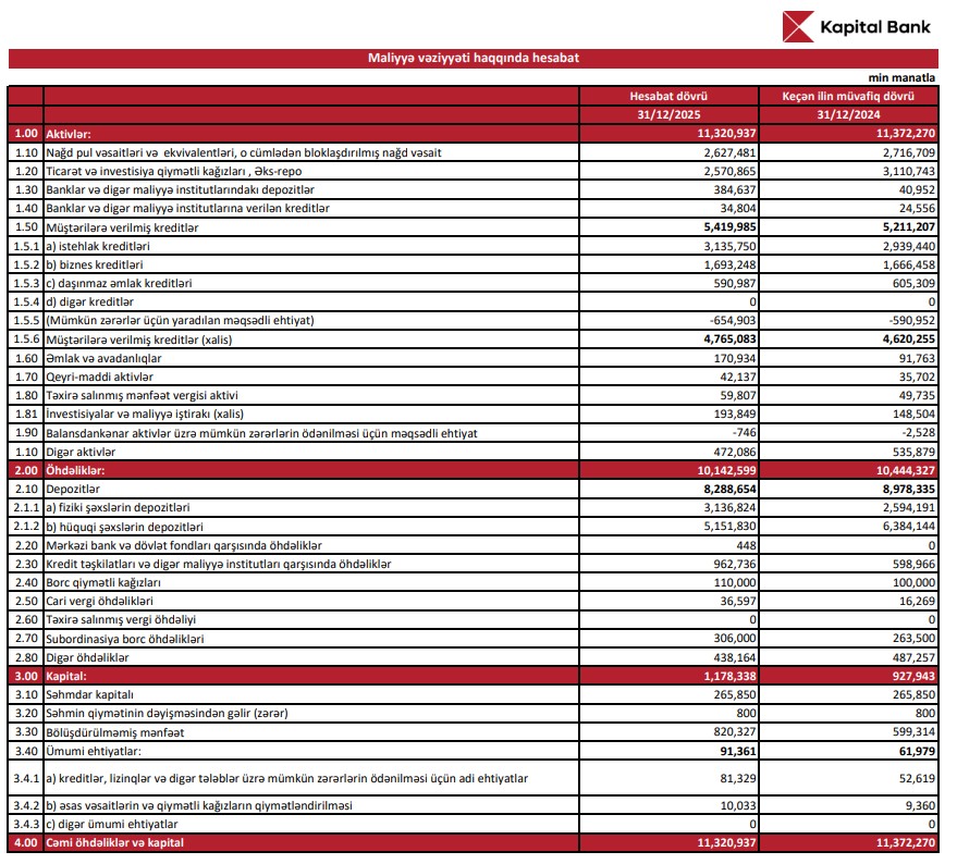 Marja xəbər verir ki, 2025-ci ildə Kapital Bankın banklar və digər maliyyə institutlarındakı depozitləri 384 milyon 637 min manata yüksəlib. 2024-cü ilin sonunda bu göstərici cəmi 40 milyon 952 min manat idi.