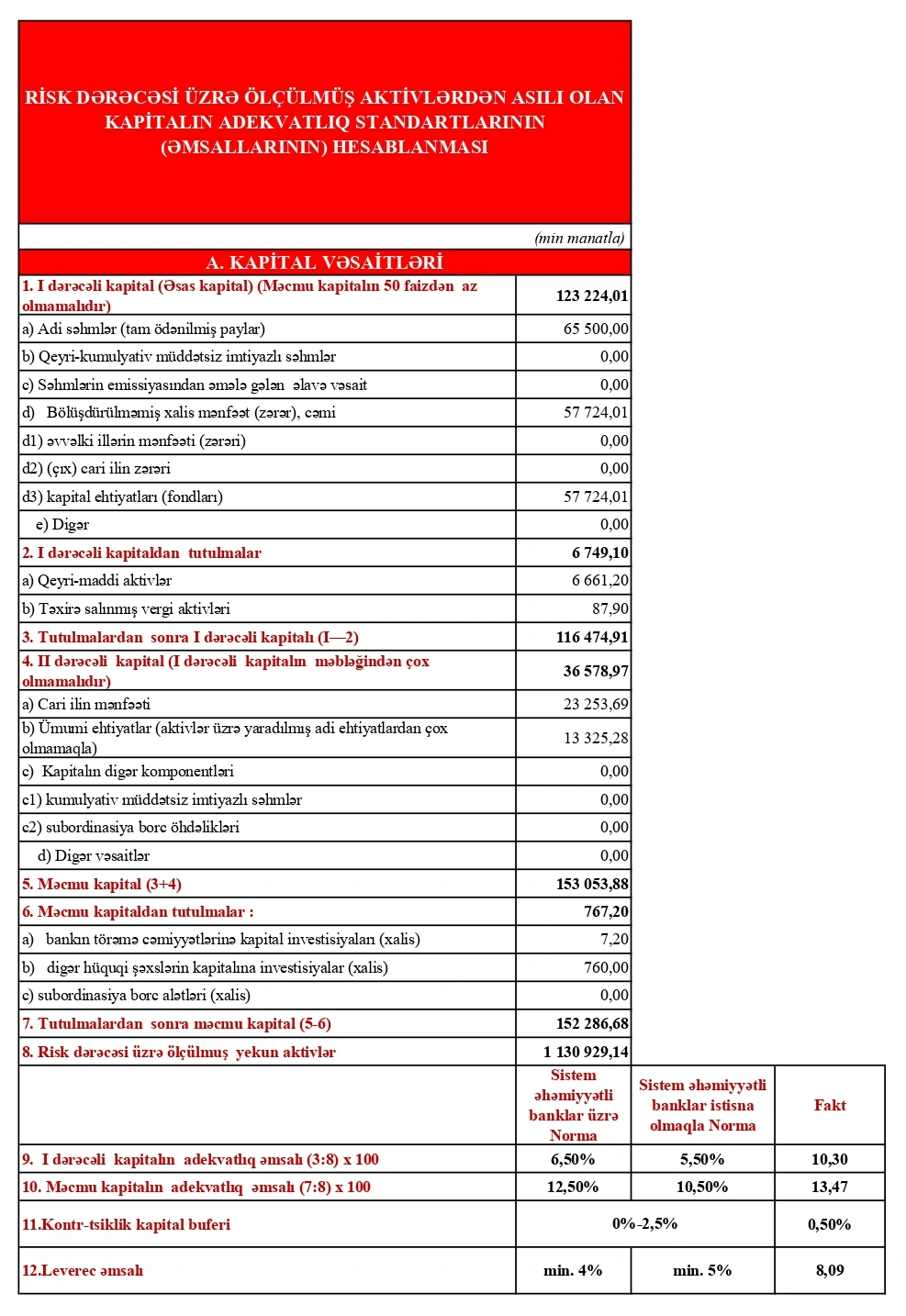 2025-ci ilin sonuna bankın məcmu kapitalı 152 milyon 287 min manat olub. Bu, 2024-cü illə müqayisədə 24 milyon 609 min manat və ya 19,3 faiz artım deməkdir. Kapitalın artması bankın risklərə qarşı dayanıqlığını və gələcək inkişaf üçün maliyyə bazasının möhkəmləndiyini göstərir.