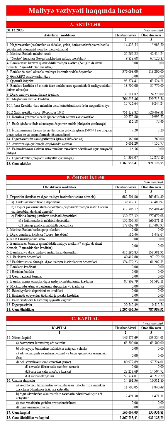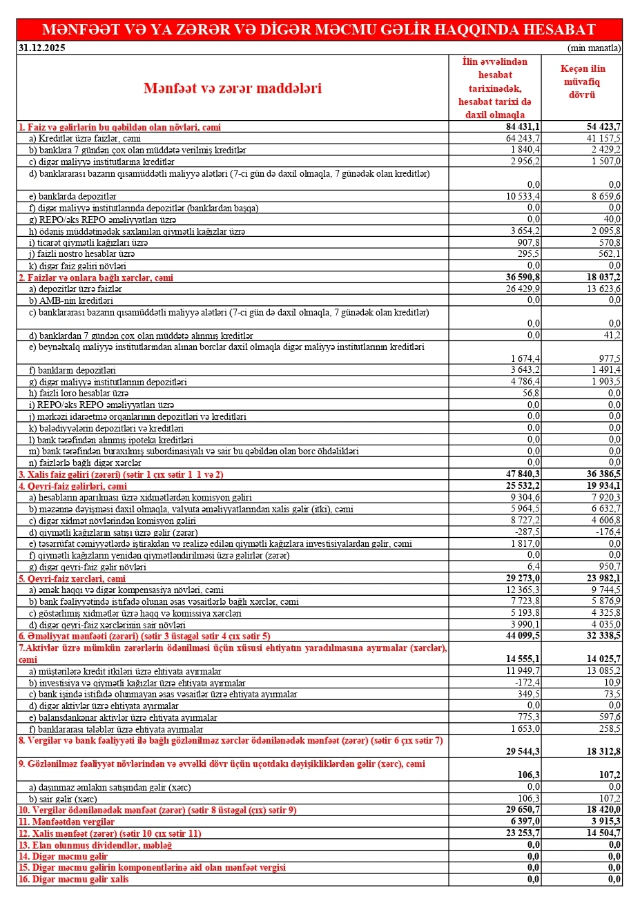 2025-ci ildə bankın xalis mənfəəti 23 milyon 254 min manat təşkil edib. Bu göstərici 2024-cü ildəki 14 milyon 508 min manatlıq mənfəətlə müqayisədə 8 milyon 746 min manat və ya 60,3 faiz çoxdur.
