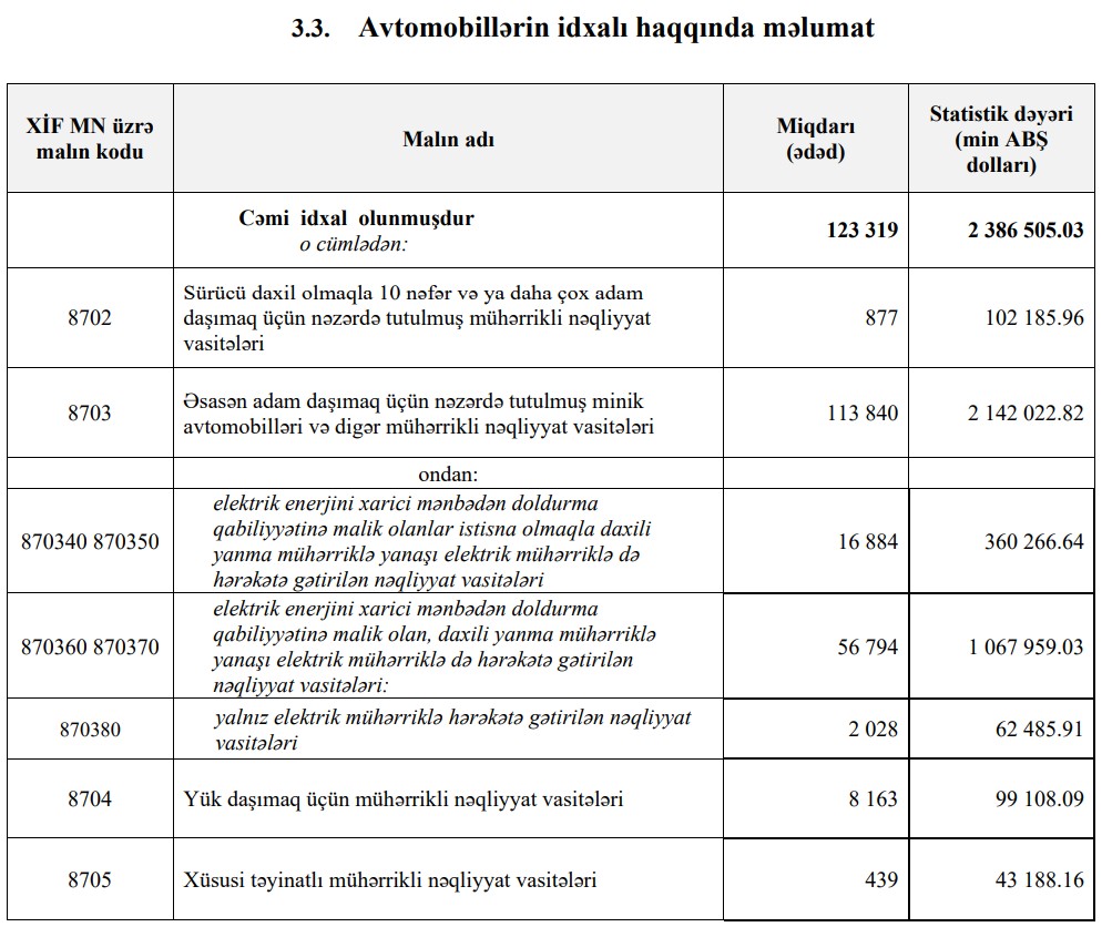 2025-ci ildə Azərbaycana 2 milyard 386 milyon 505 min dollar dəyərində 123 min 319 ədəd nəqliyyat vasitəsi (avtomobil) idxal olunub.