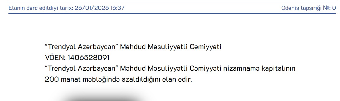 "Trendyol Azərbaycan" Məhdud Məsuliyyətli Cəmiyyəti nizamnamə kapitalının 200 manat məbləğində azaldıldığını elan edib.