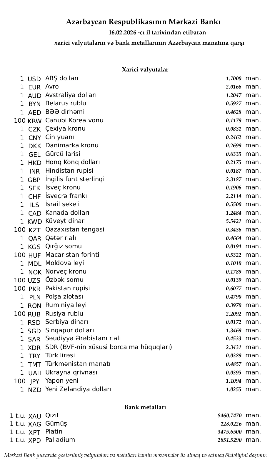 Dolların bazar ertəsi üçün rəsmi məzənnəsi müəyyən olunub