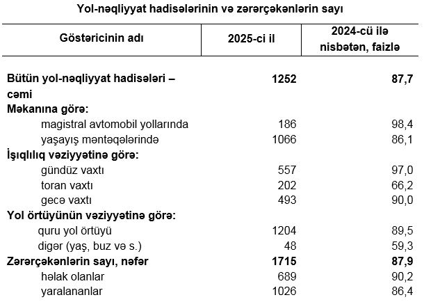 Qeyd edilib ki, 2025-ci ildə 1252 və ya 2024-cü illə müqayisədə 12,3 faiz az yol-nəqliyyat hadisəsi baş vermiş, bu hadisələr nəticəsində zərər çəkən şəxslərin sayı 12,1 faiz azalaraq 1715 nəfər olmuşdur. Onlardan 689-u həlak olmuş, 1026-sı isə yaralanmışdır. Hadisələrin 44,5 faizi gündüz, 39,4 faizi gecə, 16,1 faizi isə toran vaxtı baş vermiş, 30,3 faizi həftənin şənbə və bazar günlərinə təsadüf etmişdir.