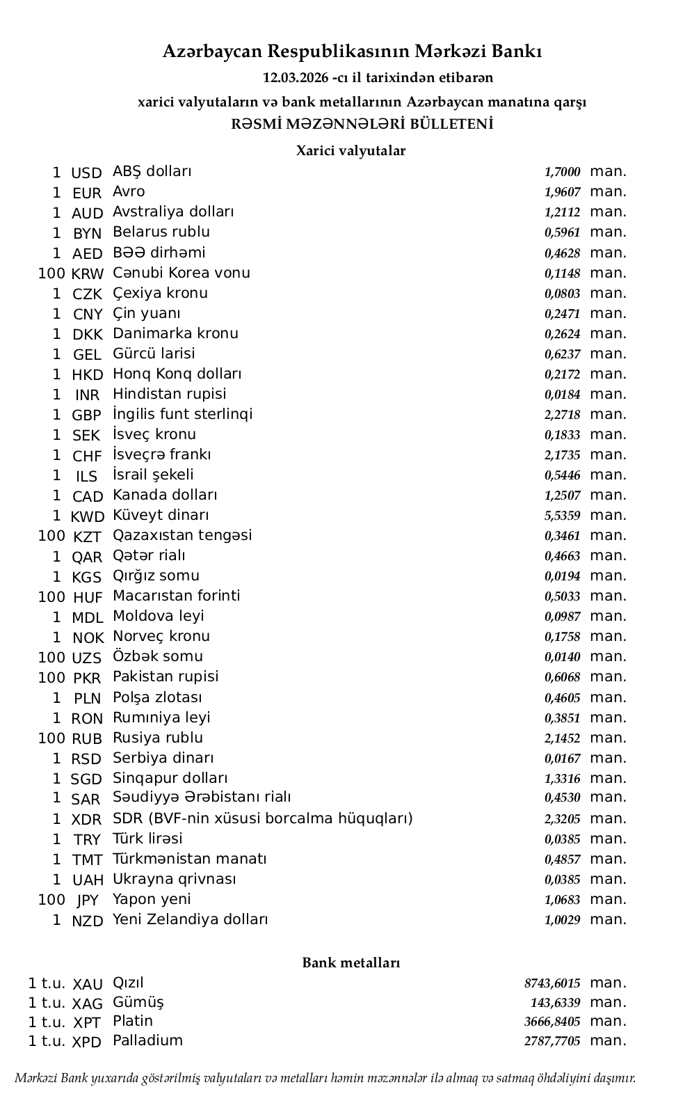 Rəsmi məzənnələr açıqlandı