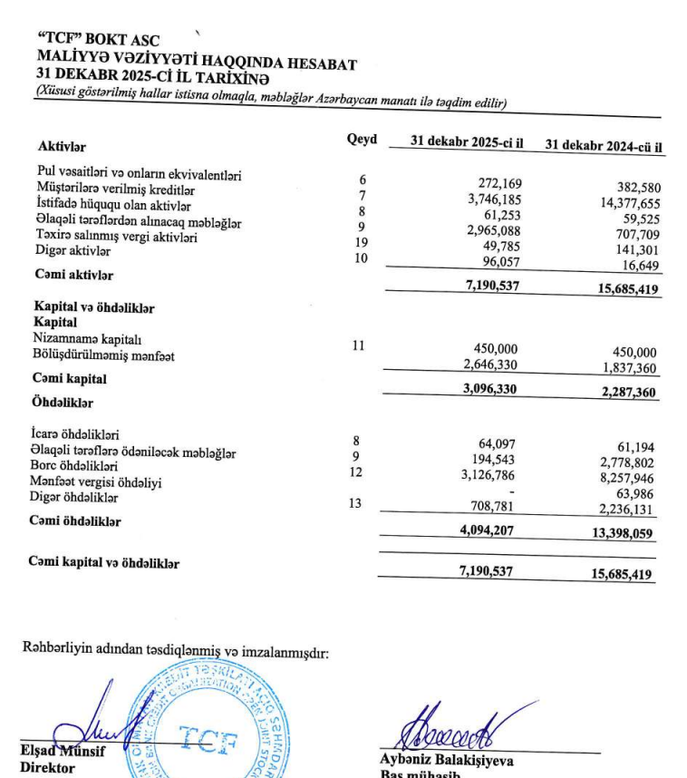 "TCF" BOKT ASC 2025-ci ili 808 min 970 manat xalis mənfəət ilə başa vurub. Kredit təşkilatı 2024-cü ili 423 min 977 manat xalis mənfəət ilə bağlamışdı. Beləliklə, ötən il "TFC" BOKT-ın xalis mənfəəti 384 min 993 manat və ya 90,8% artıb.