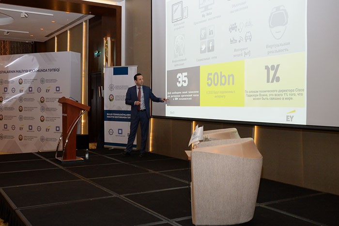 Daha sonra “Ernst&Young” şirkətinin “Bulud texnologiyalarına keçidin əsas aspektləri” mövzusunda təqdimatı dinlənilib. “Bulud”a inteqrasiyanın dünya maliyyə bazarlarına verdiyi töhfələr və “bulud” həllərinin beynəlxalq iqtisadi münasibətlərə təsirindən danışılıb.