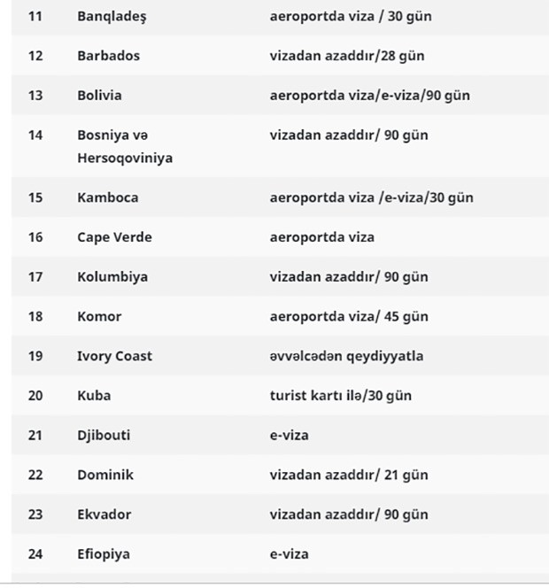 Bəzi ölkələr üzrə vizanı elektron qaydada, bəzilərində hava limanında almaq olar, bəzilərində isə vizaya ehtiyac yoxdur.