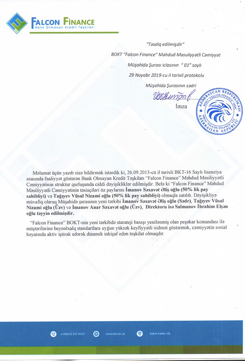 “26.09.2013-cü il tarixli BKT-16 Saylı lisenziya əsasında fəaliyyət göstərən Bank Olmayan Kredit Təşkilatı “Falcon Finance” Məhdud Məsiliyyətli Cəmiyyətinin struktur qurluşunda ciddi dəyişikliklər edilmişdir. Belə ki “Falcon Finance” Məhdud Məsiliyyətli Cəmiyyətinin təsisçiləri öz paylarını İmanov Səxavət Əliş oğlu (50% lik pay sahibliyi) və Tağıyev Vüsal Nizami oğlu (50% lik pay sahibliyi) olmaqla satılıb. Dəyişikliyə müvafiq olaraq Müşahidə şurasının yeni tərkibi İmanov Səxavət Əliş oğlu (Sədr), Tağıyev Vüsal Nizami oğlu (Üzv) və İmanov Anar Səxavət oğlu (Üzv), Direktoru isə Salmanov İbrahim Elşən oğlu təyin ediliblər.
