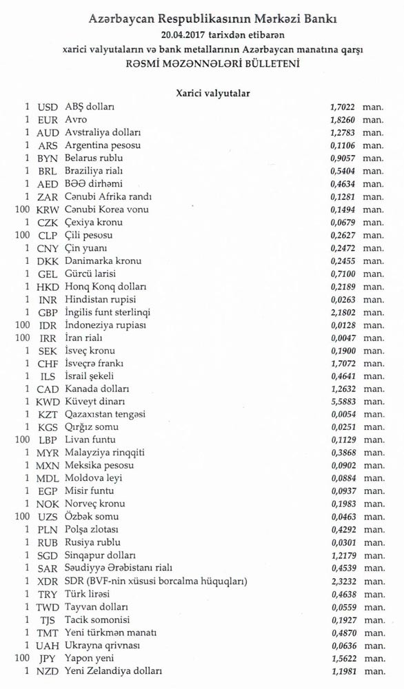 Aprelin 20-nə Mərkəzi Bankın açıqladığı rəsmi Dollar/manat məzənnəsi Aprelin 19-u ilə müqayisədə dəyişməyərək 1,7022 manat olub, Avro/manat məzənnəsi isə 1.8260 manata qalxıb.