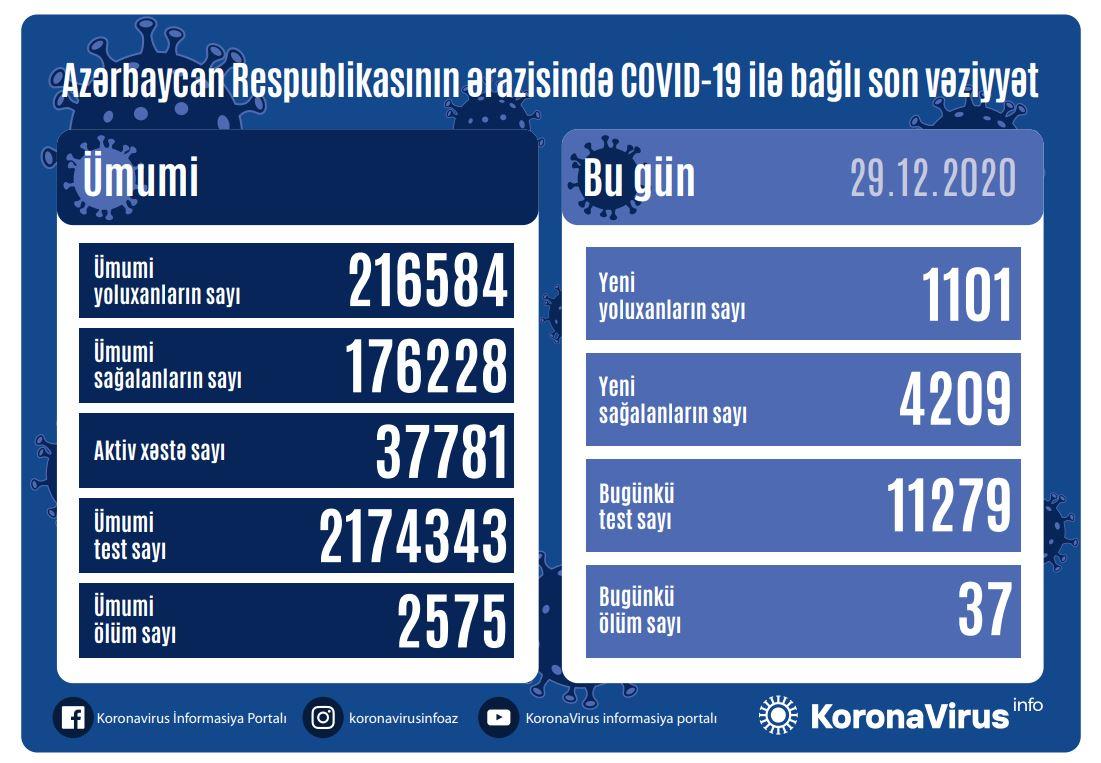 Son 24 saatda Azərbaycan Respublikasında koronavirus (COVID-19) infeksiyasına 1101 yeni yoluxma faktı qeydə alınıb, 4 209 nəfər müalicə olunaraq sağalıb.