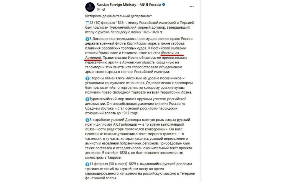 Qeyd edək ki, fevralın 22-də Rusiya XİN-in rəsmi sosial şəbəkə hesabında 1828-ci il Türkmənçay Müqaviləsi ilə bağlı təhrif olunmuş məlumat paylaşılıb. Sözügedən müqavilədə “Şərqi Ermənistan” sözünə istinad edilib.