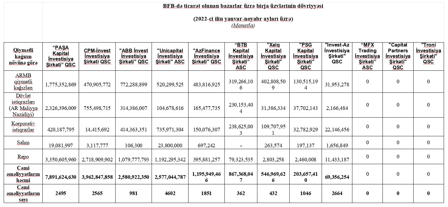 2022-ci ilin yanvar-noyabr ayları üzrə, Bakı Fond Birjasında (BFB) ticarət olunan bazarlar üzrə birja üzvlərinin dövriyyələri açıqlanıb.