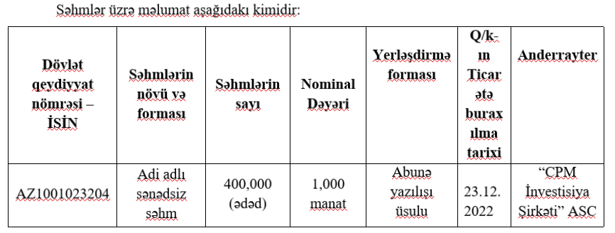 Birjanın yaydığı məlumata görə, 23 dekabr 2022-ci il tarixində qeyd olunan səhmlərin yerləşdirilməsi Bakı Fond Birjasında abunə yazılışı üsulu ilə həyata keçiriləcəkdir.